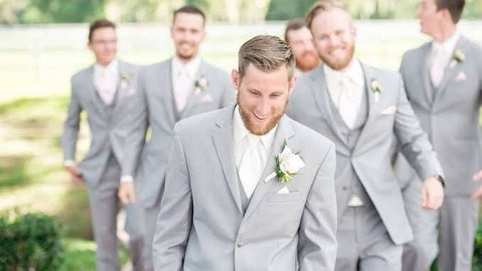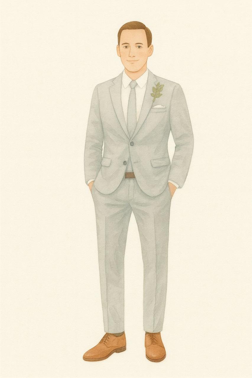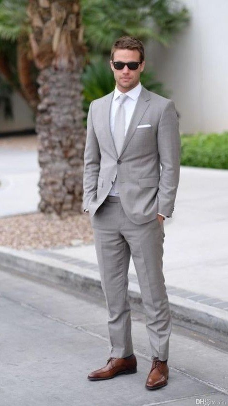 Como informado em nosso manual, para vocês indicamos um terno cinza claro, sapato marrom, camisa branca e a gravata que lhe presenteamos!